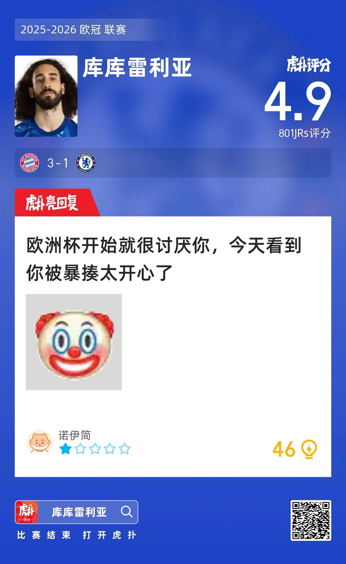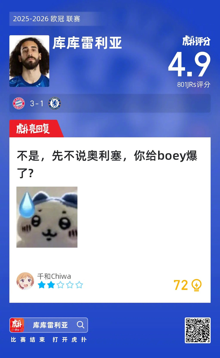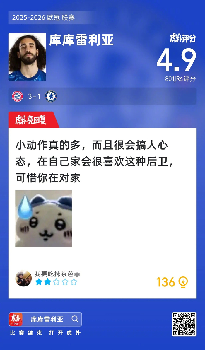 #拜仁3比1切尔西#库库雷利亚赛后收获4.9的虎扑评分!