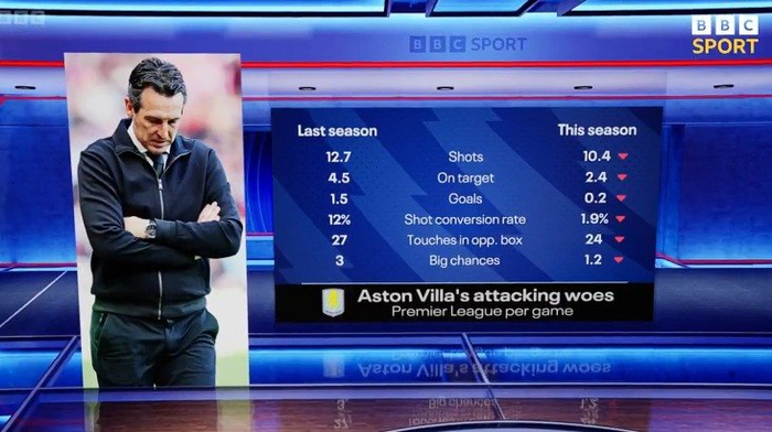 这是维拉本赛季5轮英超打进的唯一进球,BBC也盘点了维拉本赛季英超相较上赛季的场均进攻数据,可谓全面下滑,具体如下: