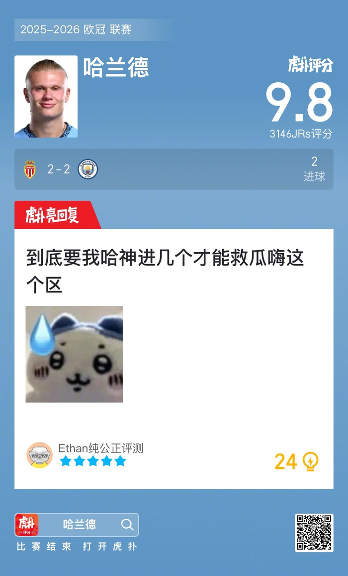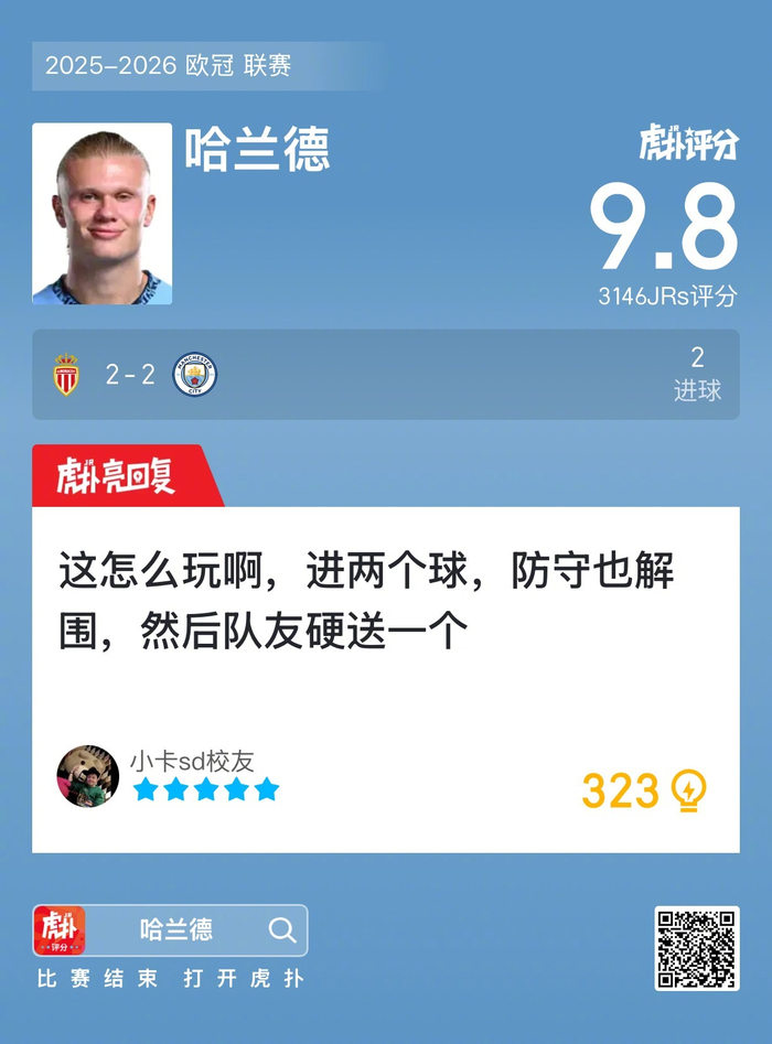 #摩纳哥2比2曼城#哈兰德打进两球,赛后收获9.8的虎扑评分!