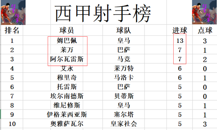 射手榜方面,姆巴佩火力很猛,场均超过1球,12轮打入13球高居榜首。莱万和阿尔瓦雷斯7球并列第2,艾永,穆里奇6球并列第4。维尼修斯,埃尔南德斯,托雷斯等人5球刚好挤入前十。