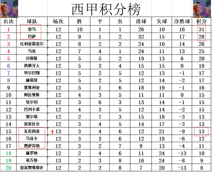 积分榜方面,前12轮,皇马3分优势力压巴萨领跑,本轮巴萨将在主场对战劲敌毕尔巴鄂竞技,皇马则是客场对阵埃尔切。瓦伦西亚今天最后阶段绝杀赢球拿下保级大战,他们就暂时超过马洛卡,奥萨苏纳上升到15位,输球的莱万特还是倒数第2陷在降级区内。
