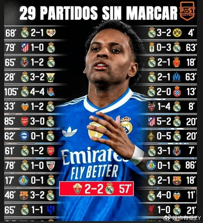 北京时间12月1日凌晨,2025/26赛季西甲联赛14轮上演一场焦点战。领头羊皇家马德里客场1-1战平保级球队赫罗纳遭遇联赛3连平,排名也被巴萨反超跌至积分榜第2位。此役,巴西球星罗德里戈在第72分钟替补出场但毫无建树,而这也让他的进球荒场次达到了30场,追平了皇马队史纪录。