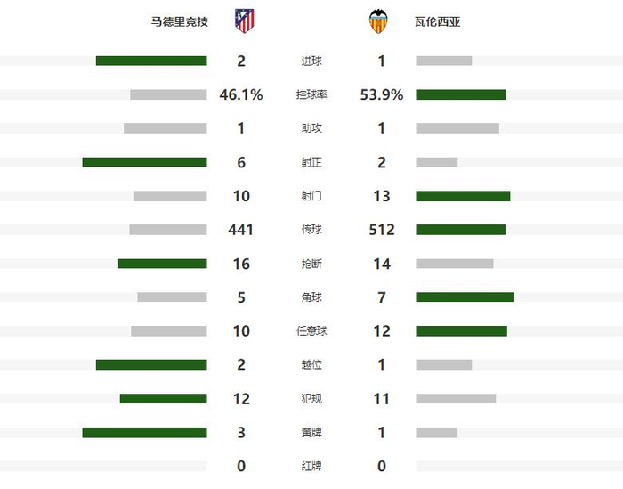 第63分钟瓦伦西亚扳平了比分,贝尔特兰左路内切,晃开上抢的阿尔马达后,突然起脚远射,轰出一脚无解的世界波,皮球擦着立柱飞入球网,让奥布拉克也无可奈何,将比分追至1平,不过蝙蝠军团并没有开心太久,第74分钟替补登场的格列兹曼,前插接到队友挑传后,用一脚世界级的停球,给自己抽射创造出了机会,帮助马竞将全场比分定格为了2-1。