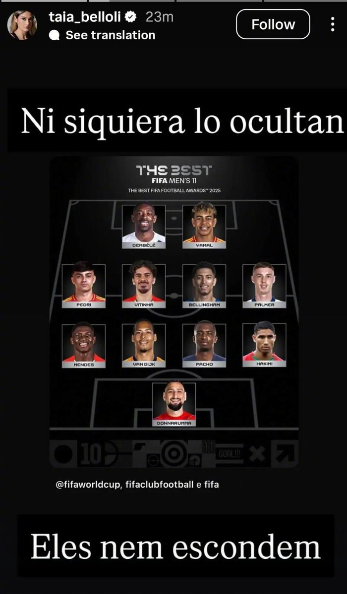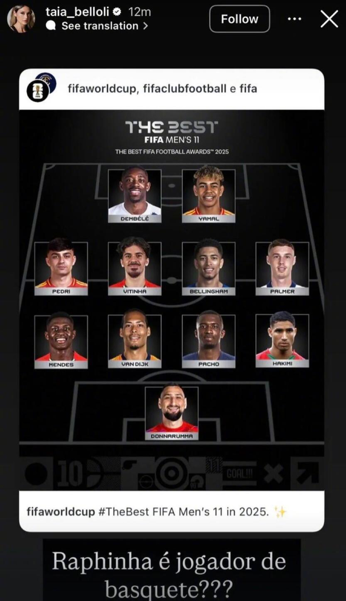 #2025FIFA年度颁奖典礼# 【拉菲尼亚妻子社媒三连开炮:直指FIFA最佳11人阵容评选不公】在FIFA公布2025年最佳男足11人的阵容后,巴塞罗那边锋拉菲尼亚的妻子通过社交媒体表达不满,已经连续发布多条动态。