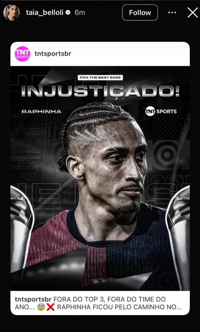 最新一条动态中,她转发了巴西媒体TNT Sports制作的拉菲尼亚海报,图中直接写道“被不公正对待”,并指出拉菲尼亚无缘年度最佳阵容以及相关评选。