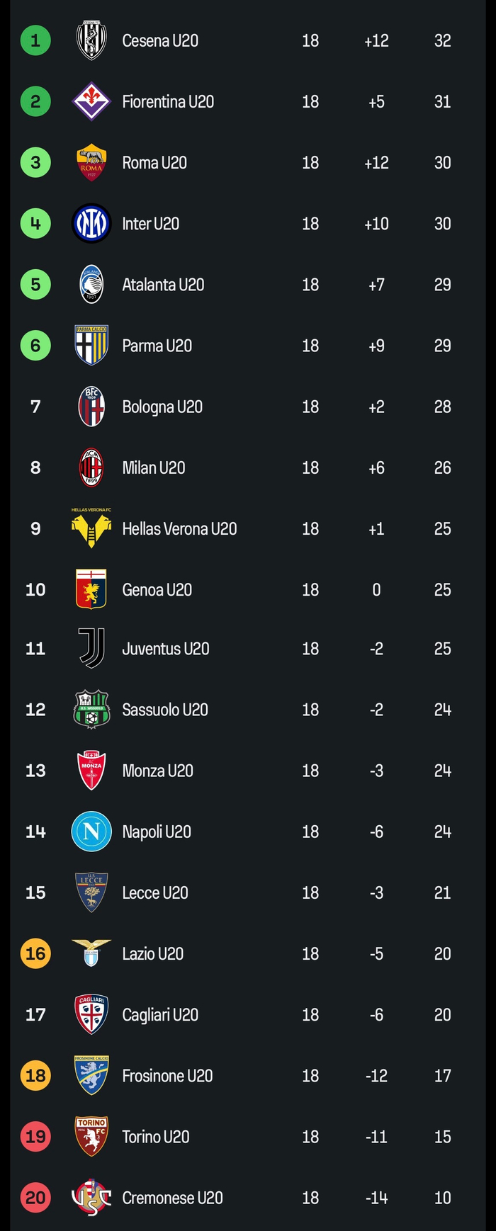 【预备队积分榜】2025-26赛季#意甲# 预备队联赛第18轮积分榜: