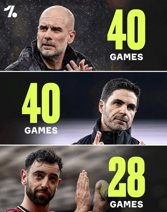 根据One Football的统计,曼城和阿森纳本赛季都已经踢完了40场比赛,而曼联要到本赛季英超联赛结束才会达到这么多的场次数。