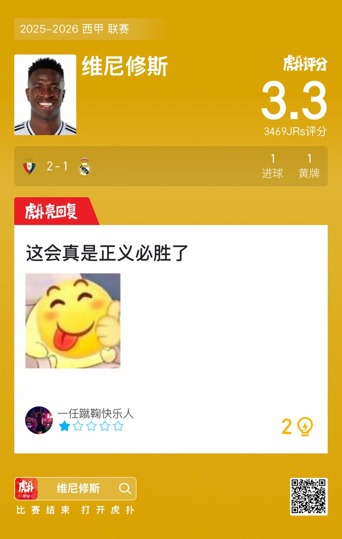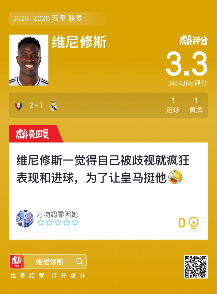 #奥萨苏纳2比1皇马#维尼修斯打进一球,吃到一张黄牌,赛后收获3.3的虎扑评分!