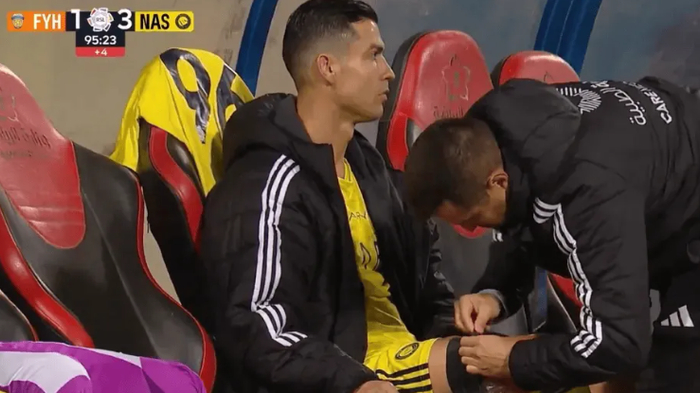 凌晨3点,利雅得胜利在客场3-1逆转费哈,重回积分榜首。但这本该欢庆的胜利之夜,却因为一张照片变得凝重:41岁的C罗坐在替补席上,大腿敷着厚厚的冰袋,眼神里满是疲惫。