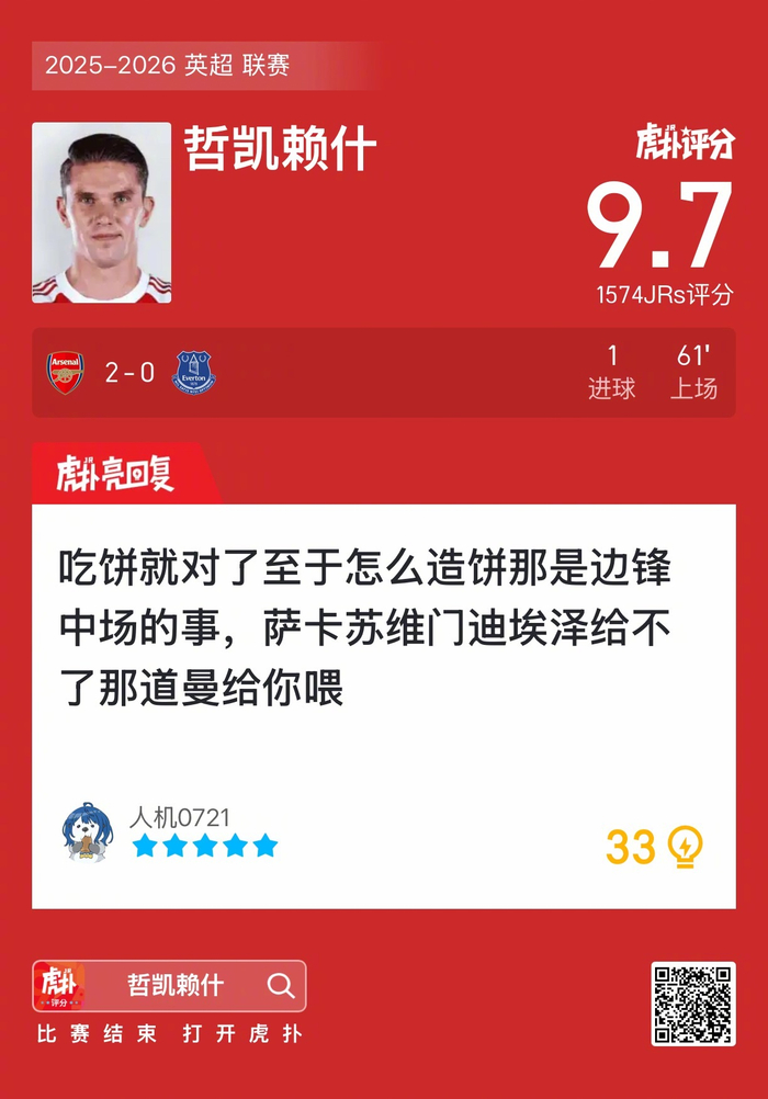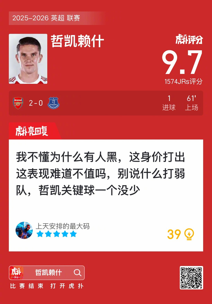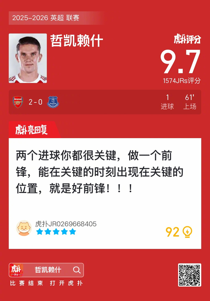 #阿森纳2比0埃弗顿#哲凯赖什打进一球,这表现你给几分?