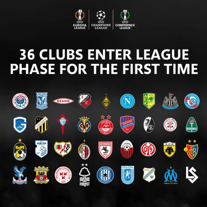 本赛季共有36支球队首次参加新欧战联赛阶段的比赛,其中那不勒斯、纽卡斯尔联、斯特拉斯堡、塞尔塔、比利亚雷亚尔、弗赖堡、巴列卡诺、美因茨、水晶宫、诺丁汉森林、马赛都作为五大联赛的球队首次参赛。