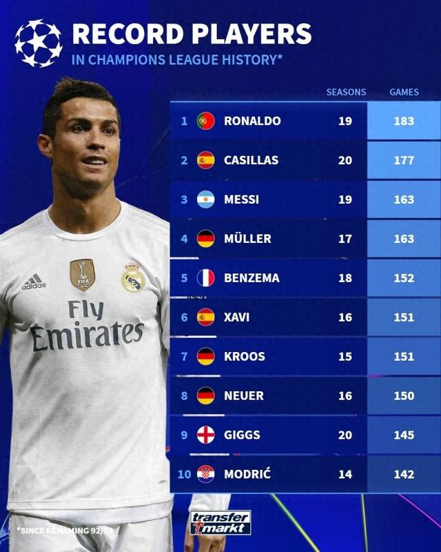 直播吧09月16日讯 今夜,新赛季欧冠就将打响。德转在赛前列出了欧冠历史出场榜,C罗以183场位列榜首,卡西、梅西分列二三。