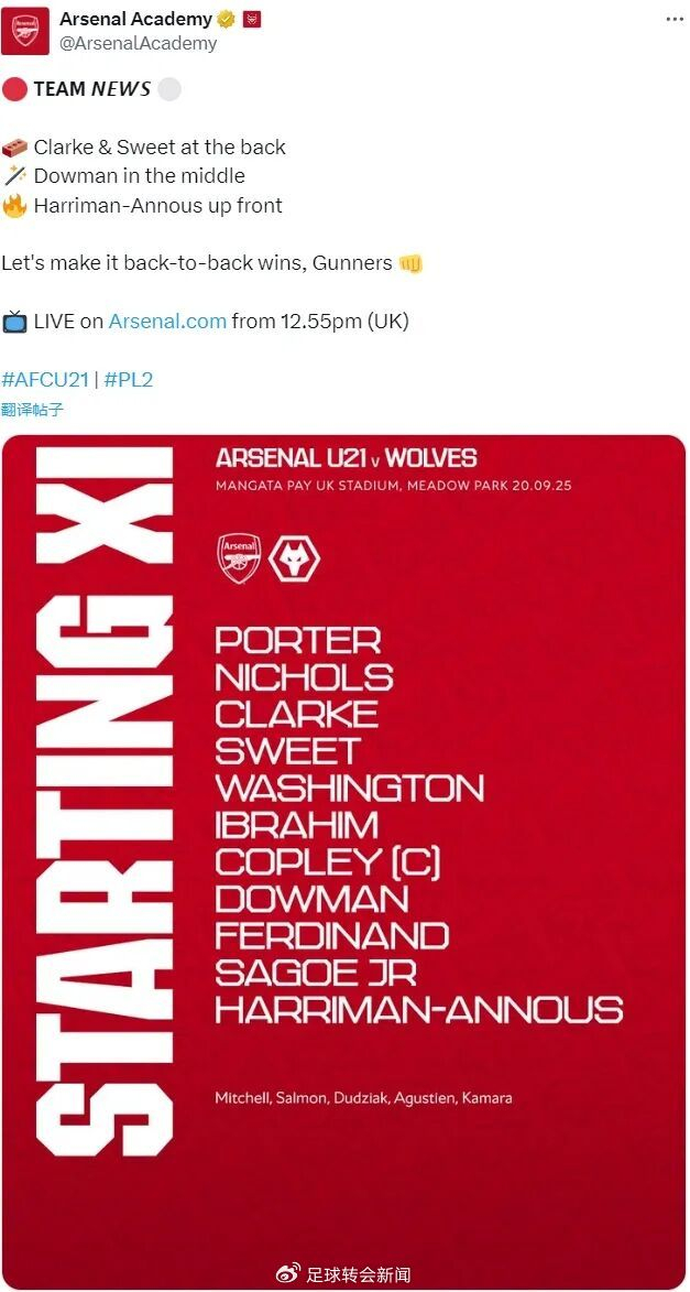 北京时间周六晚,道曼首发出战了阿森纳u21对阵狼队的英超预备队比赛。而阿森纳对曼城的比赛在周日晚……