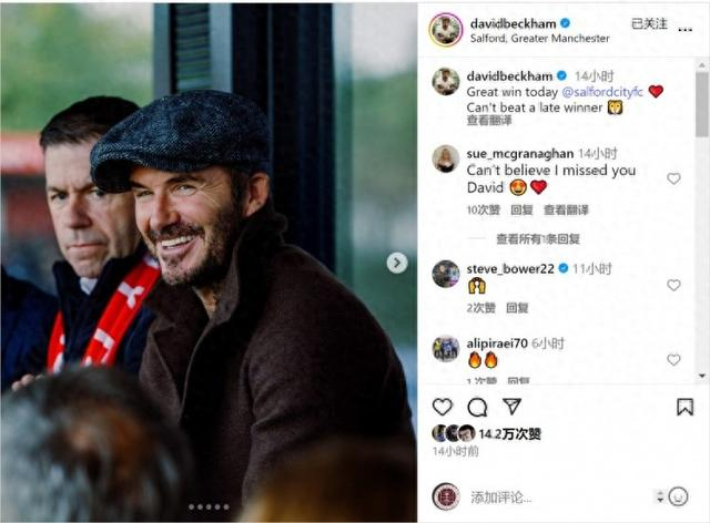 索尔福德城老板之一贝克汉姆在现场观看了这场比赛,他在社交媒体上晒出照片,配文:“索尔福德城今天取得精彩胜利,没有什么比最后时刻的绝杀更棒的了。”