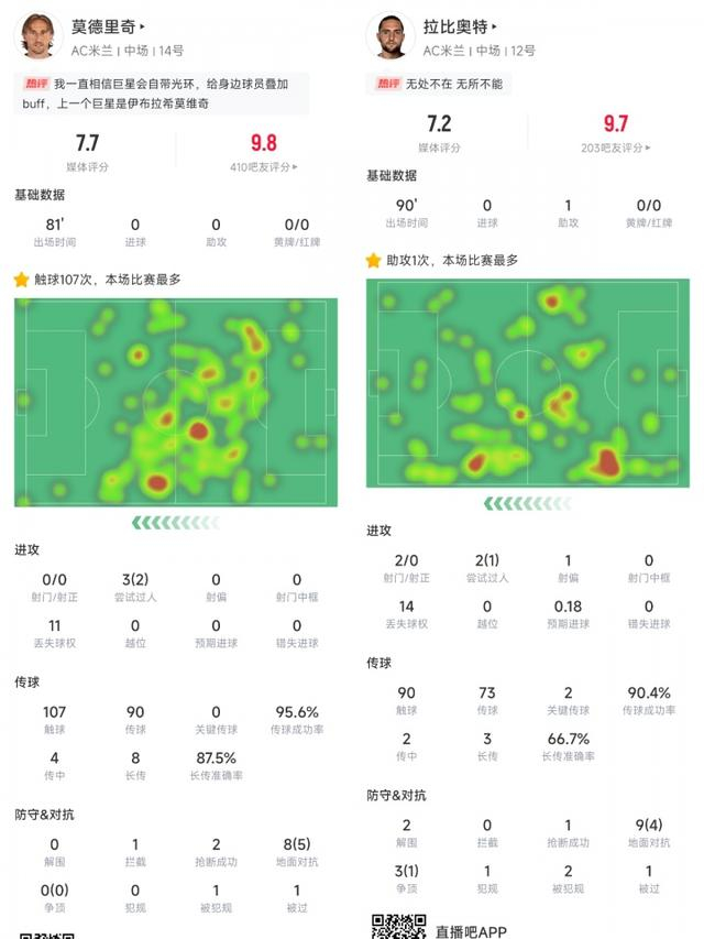 本场比赛米兰中场双核拉比奥特和莫德里奇表现出色,拉比奥特全场完成90次触球,73次传球并送出1次助攻,传球成功率90.4%;莫德里奇更是完成了全场最高的107次触球,以高达95.6%的成功率送出了90次传球。