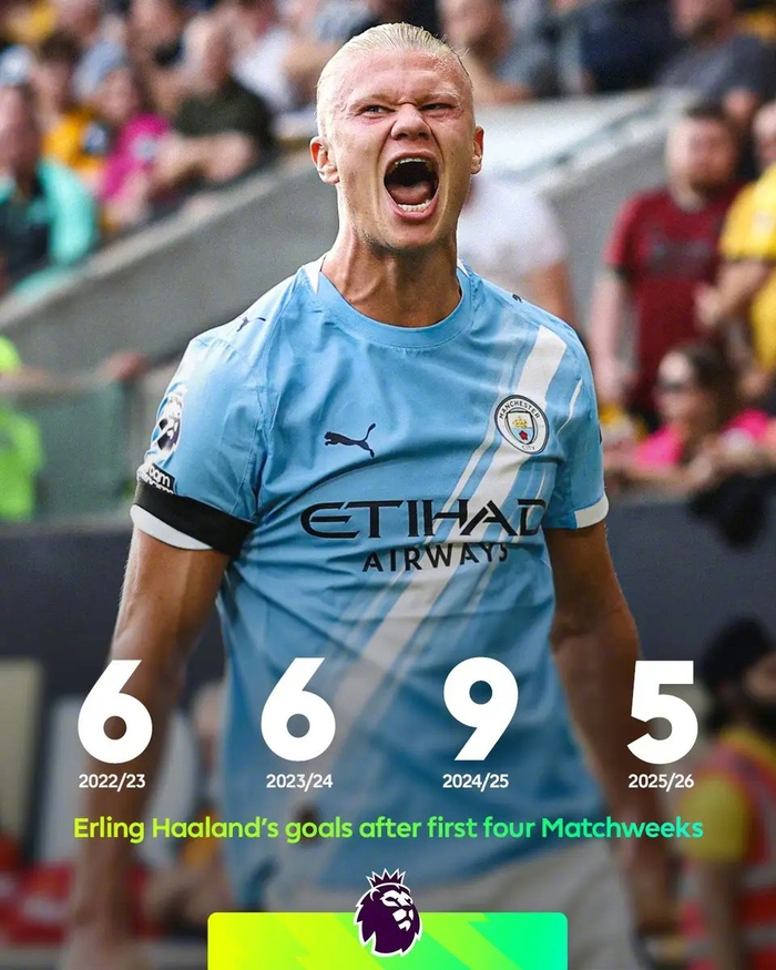 英超官号发布推文称,赛季前4场比赛打进5球,这实际上是埃尔林·哈兰德在曼城最糟糕的赛季开局
