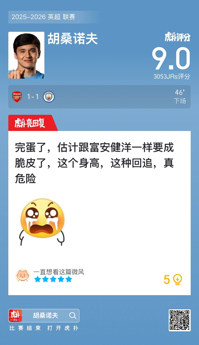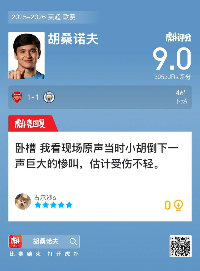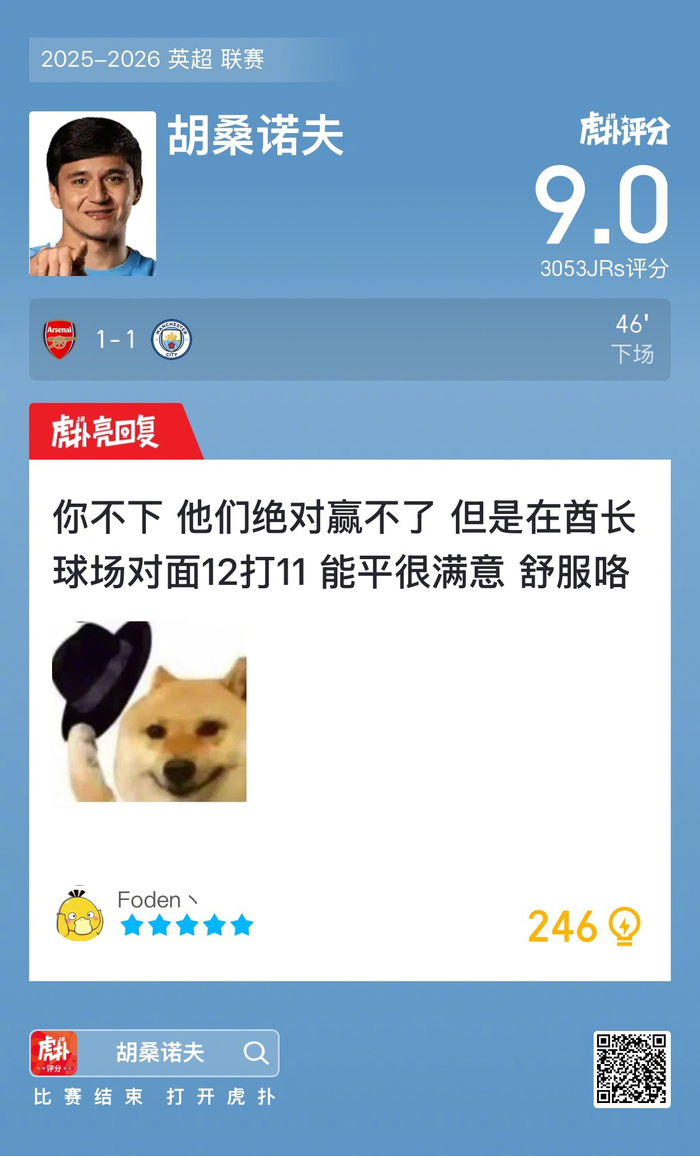 #阿森纳1比1曼城#胡桑诺夫赛后收获9分的虎扑评分!