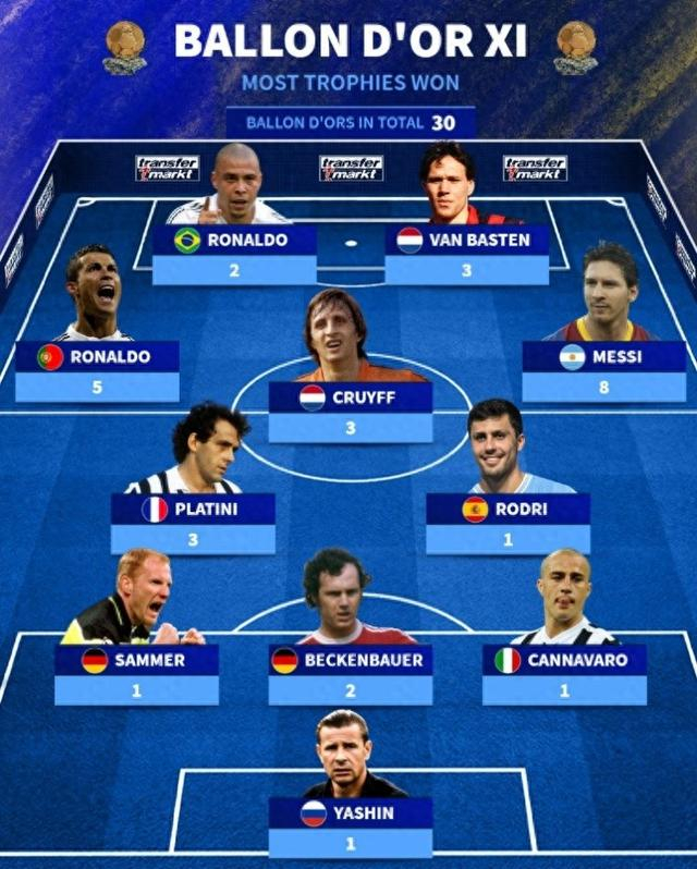 前锋:C罗(5次)、罗纳尔多(2次)、范巴斯滕(3次)、梅西(8次)