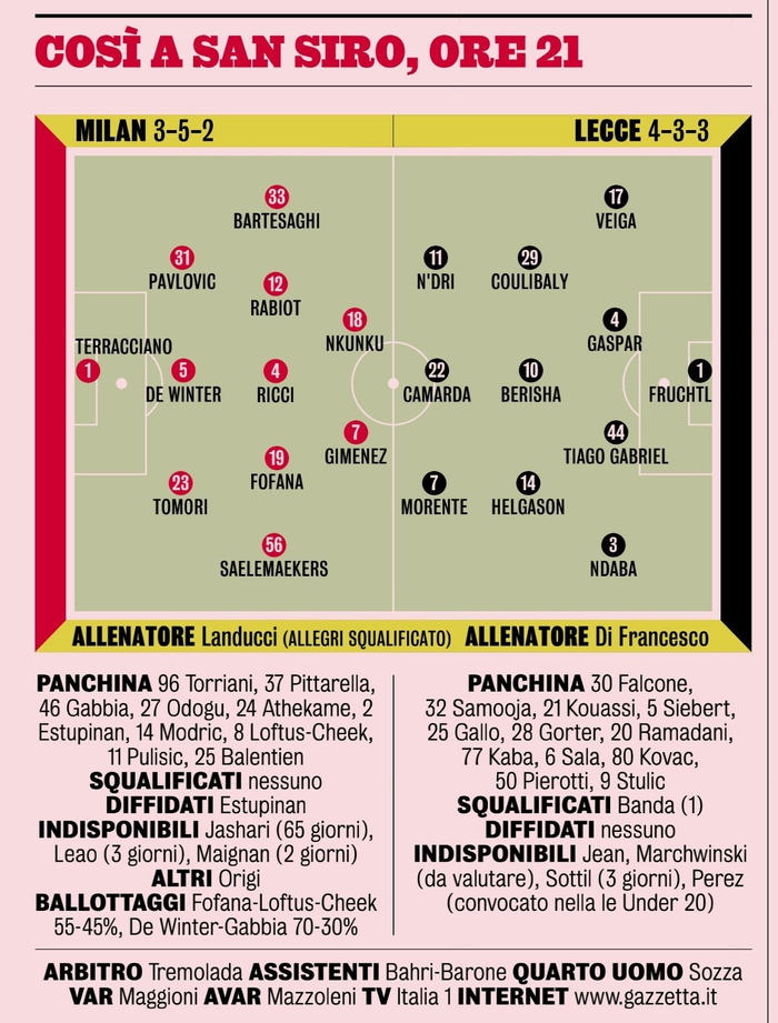 【米体】该媒体更新了2025-26赛季#意大利杯# 第二轮 -🔴⚫️米兰主场对阵莱切队「最新预计首发阵容」(352):