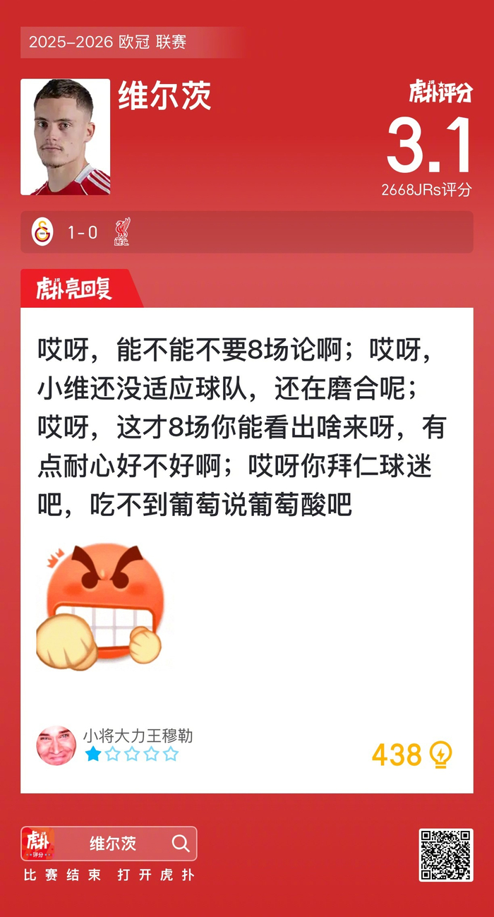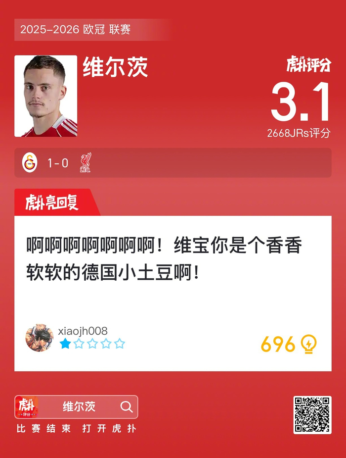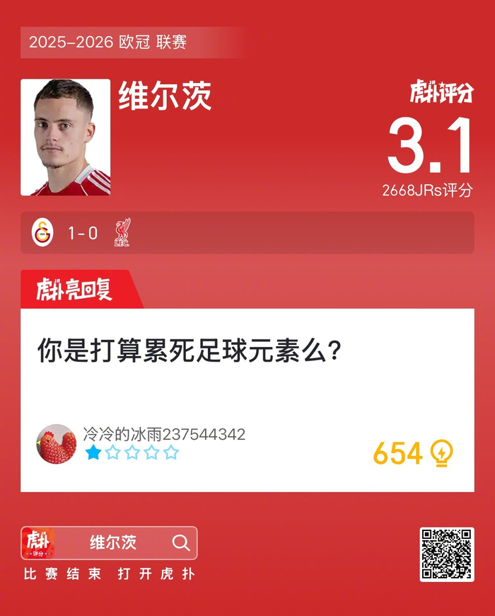#加拉塔萨雷1比0利物浦#维尔茨赛后仅收获3.1的虎扑评分!