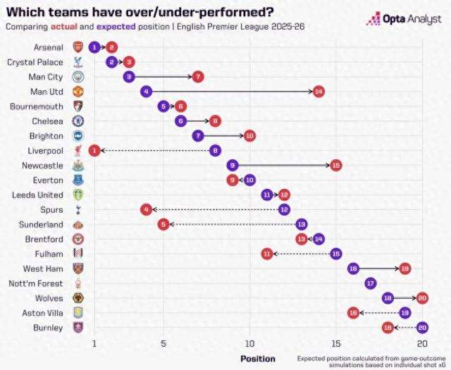 根据OPTA的统计,曼联本赛季至今的预期排名在第四位,但他们实际排在第14位,是实际排名与预期排名相差最大的球队。而实际排名比预期排名最好的球队是热刺和桑德兰,两队实际排名比预期排名高8位。