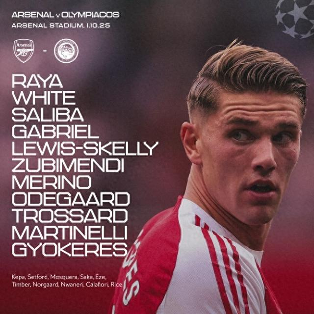 阿森纳vs奥林匹亚科斯首发:1-拉亚、2-萨利巴、4-本-怀特、6-加布里埃尔、49-斯凯利、8-厄德高、36-苏维门迪、23-梅里诺、11-马丁内利、19-特罗萨德、14-约克雷斯