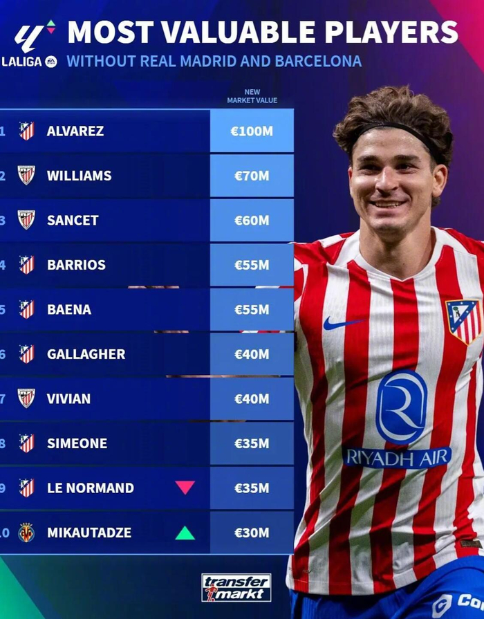德国转会市场盘点了目前未效力于皇家马德里和巴塞罗那两大豪门的西甲球员,并按照身价进行排行:(货币单位均为欧元)。