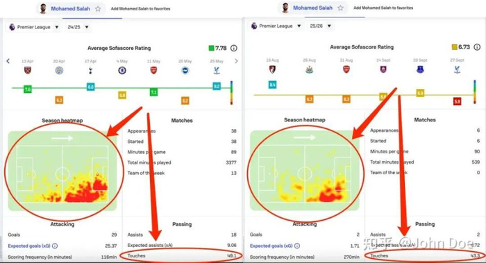 我们拿出sofascore的对比出来,法老在左边和左肋接球的空间一点没少,依旧是在24/25的活跃空间里,我们可以拿热图交叉叠放6倍,得出来的热图结果会几乎和24/25没有太大的差异。