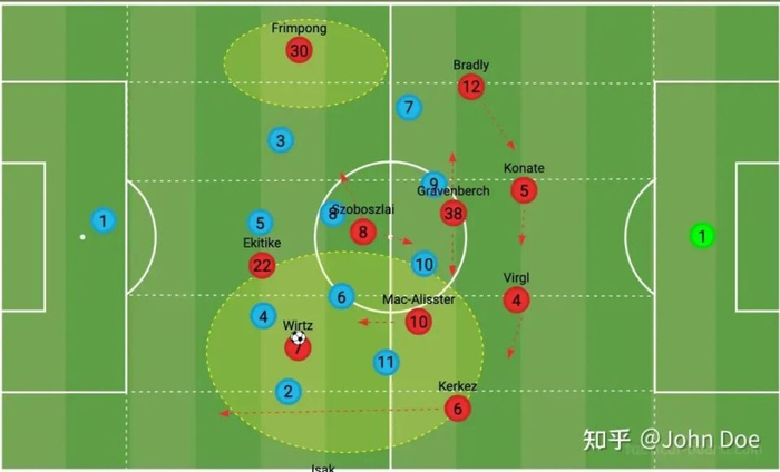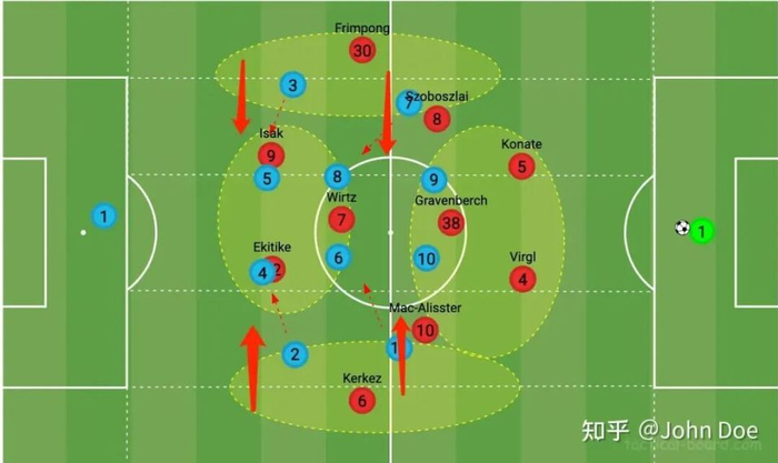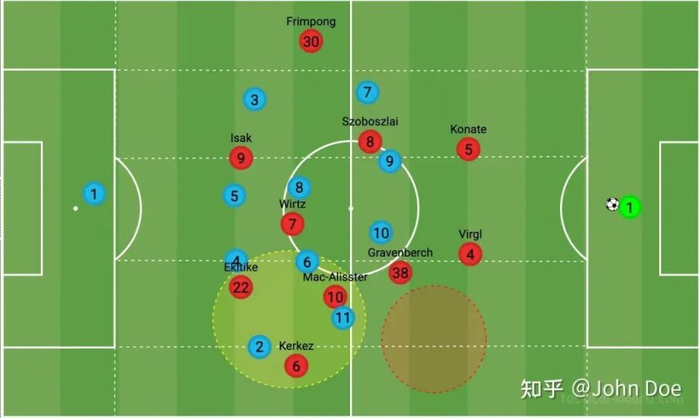只要对方压缩防守的宽度,防守站位收窄,那么这一侧的进攻球员也仅仅只有3个,基本上会面对对方4人的压缩空间防守,而无论是索博斯洛伊、麦卡利斯特、伊萨克、埃基蒂克都很难承担同时具备爆点加推进功能。