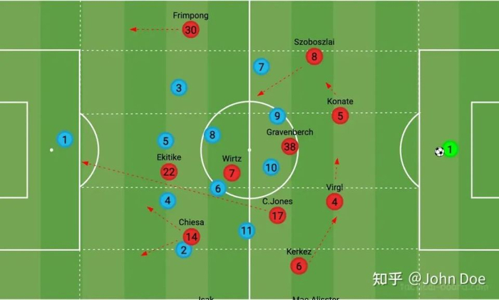 而斯洛特为了解决法老这一侧的效率低下的进攻问题,采用「拆东墙补西墙」的方式,通过抽调中场和边后卫插上来弥补跑动不足带来的边路降速问题,而因为缺乏演练和配合,反而带来更大的防守方面的漏洞。