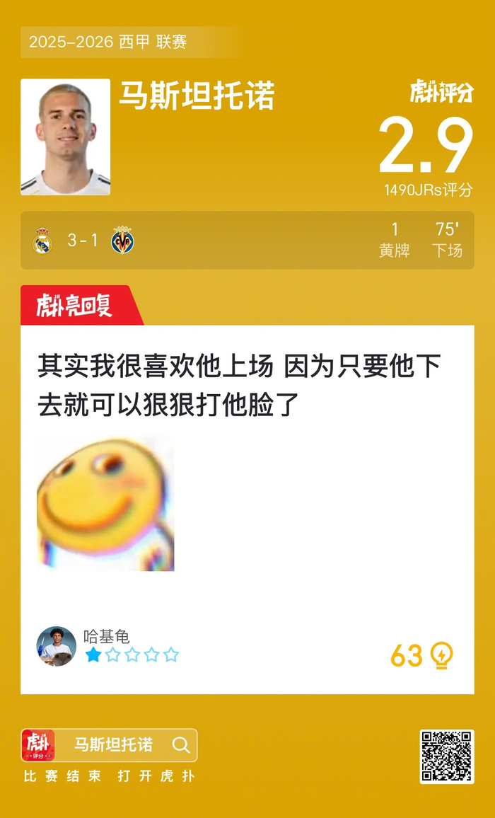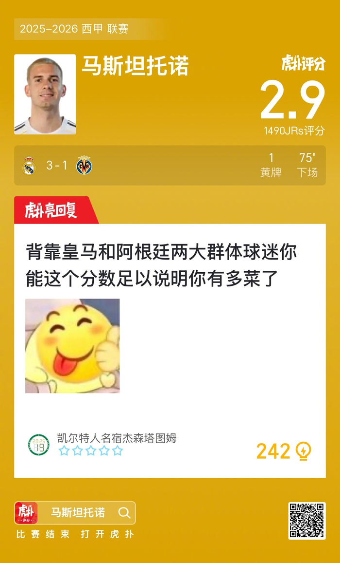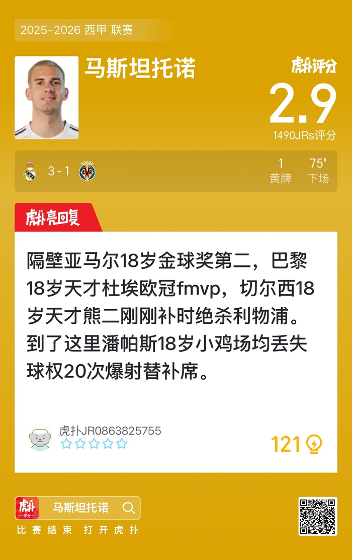 #皇马3比1比利亚雷亚尔#马斯坦托诺赛后收获2.9的虎扑评分!