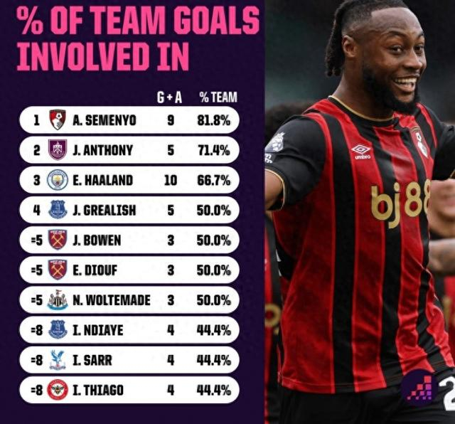 直播吧10月8日讯 本赛季,伯恩茅斯边锋塞梅尼奥延续了出色的状态,他在球队进攻中的重要性不言而喻。根据OPTA的数据统计,塞梅尼奥参与进球数占球队总进球数的81.8%,为英超球员最高。