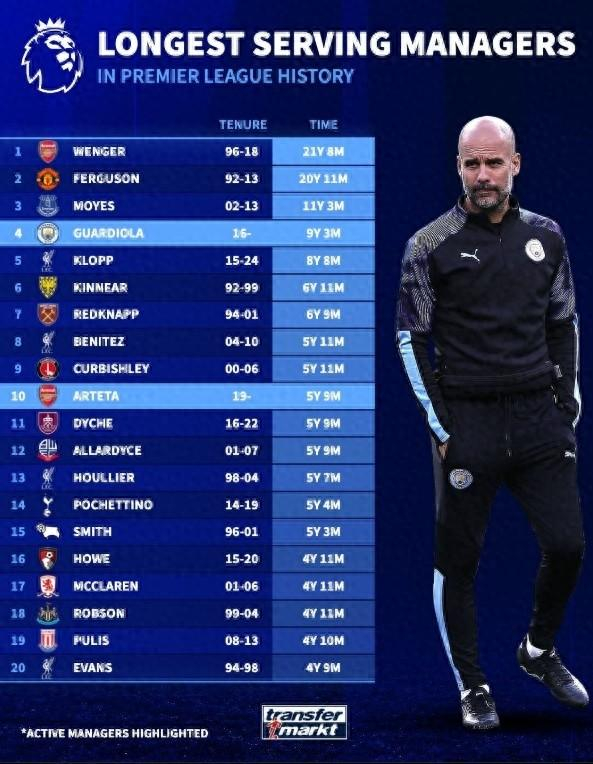 直播吧10月9日讯 德转列出了英超历史上的主帅任职时长榜,温格、弗格森前二,瓜迪奥拉第四,克洛普第五。