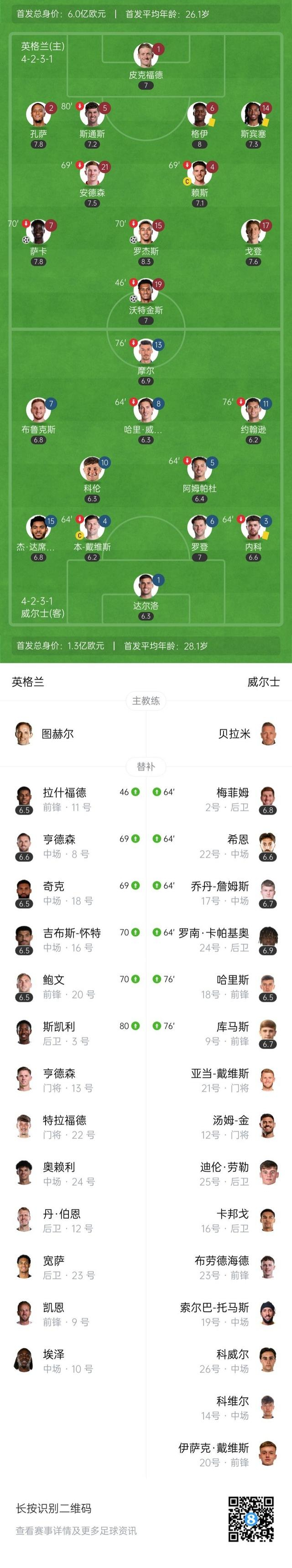 直播吧10月10日讯 足球友谊赛 英格兰坐镇主场温布利迎战威尔士。上半场,罗杰斯、沃特金斯、萨卡连进三球。易边再战,双方均无建树。最终英格兰3-0威尔士取三连胜。