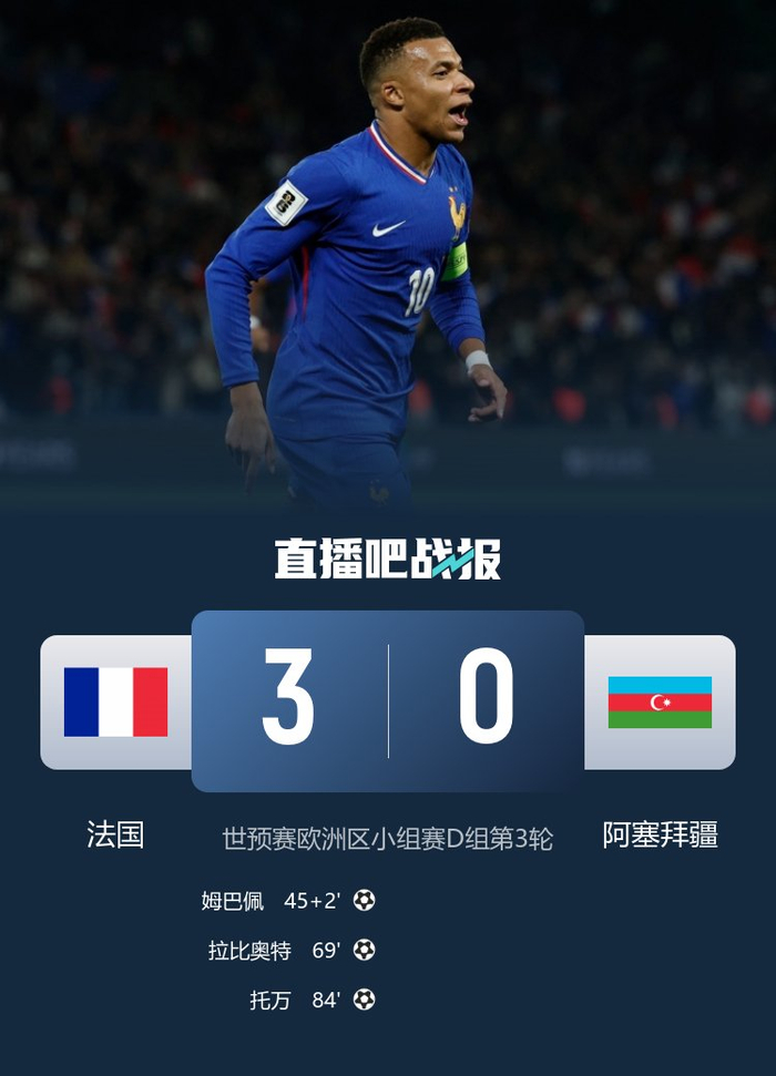 法国队3-0击败阿塞拜疆,自2022年3月25日对阵科特迪瓦以来,法国队首次在一场比赛中没有任何一名巴黎圣日耳曼球员出场,结束了连续46场国家队比赛中都有巴黎球员参赛的纪录。