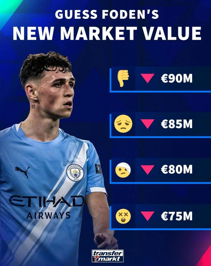 德国转会市场近期将更新英超球员的身价,曼城中场福登的身价将铁定会下降。