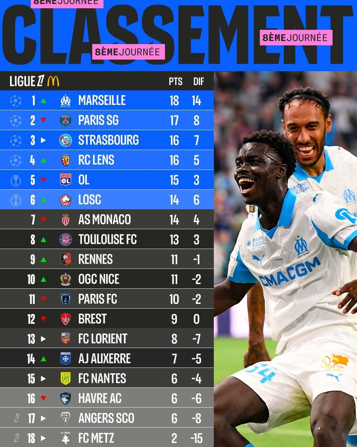 【法甲积分榜】 #法甲# 2025-26赛季法甲联赛第八轮积分榜。![]()