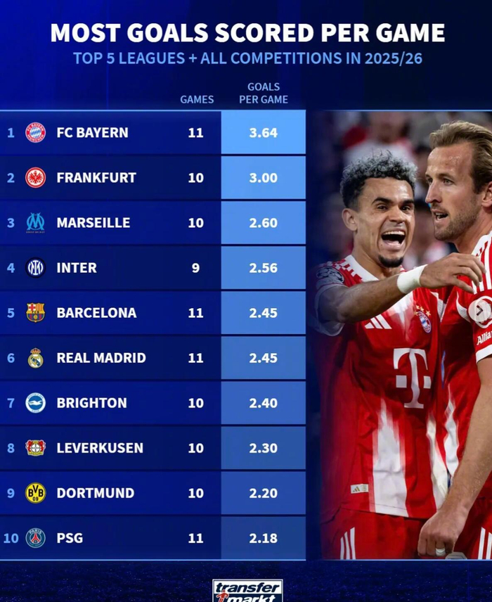 拜仁场均打进3.64球高居榜首,另一支德甲球队法兰克福场均打进3球排名第二,马赛以场均2.6球排名第三。