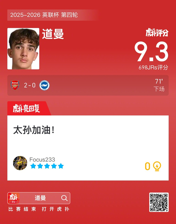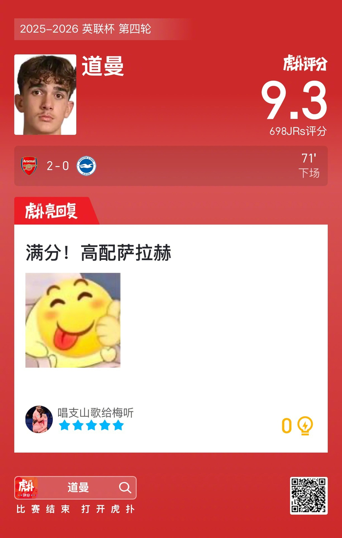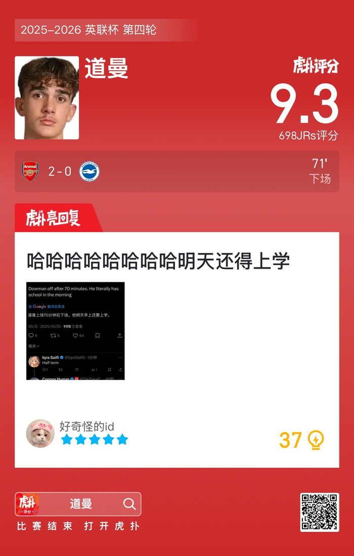 #阿森纳2比0布莱顿#道曼赛后收获9.3的虎扑评分!
