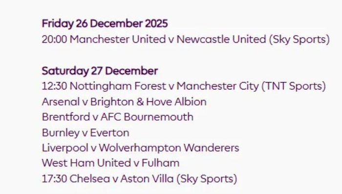 英超官方公布12月及1月的赛程安排,今年的节礼日(12月26日)仅有曼联对阵纽卡斯尔这一场比赛。而该轮其他赛事安排在27日和28日。