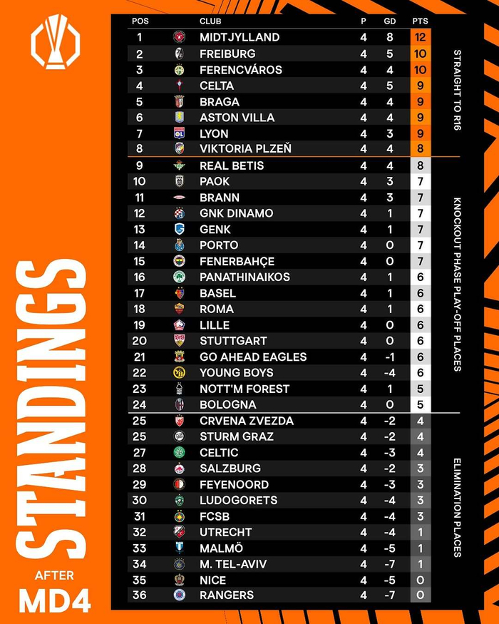 【欧联杯积分榜】 2025-26赛季#欧联杯# 第四轮积分榜。