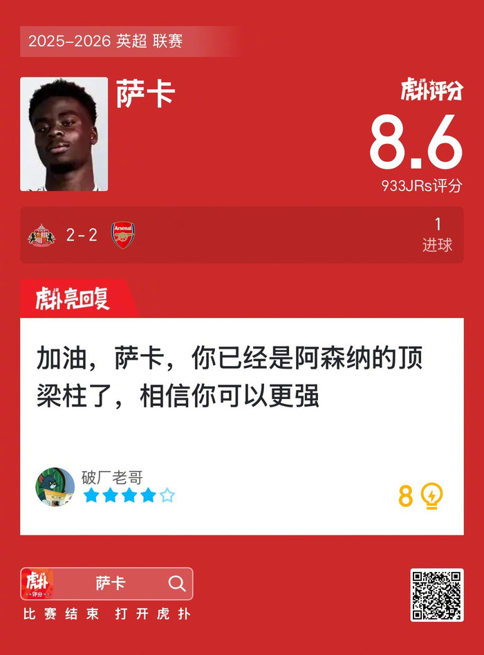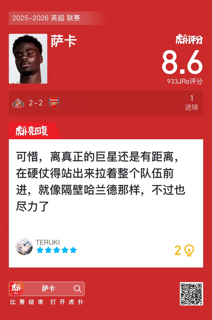 #桑德兰2比2阿森纳# 萨卡打进一球,赛后收获8.6的虎扑评分!
