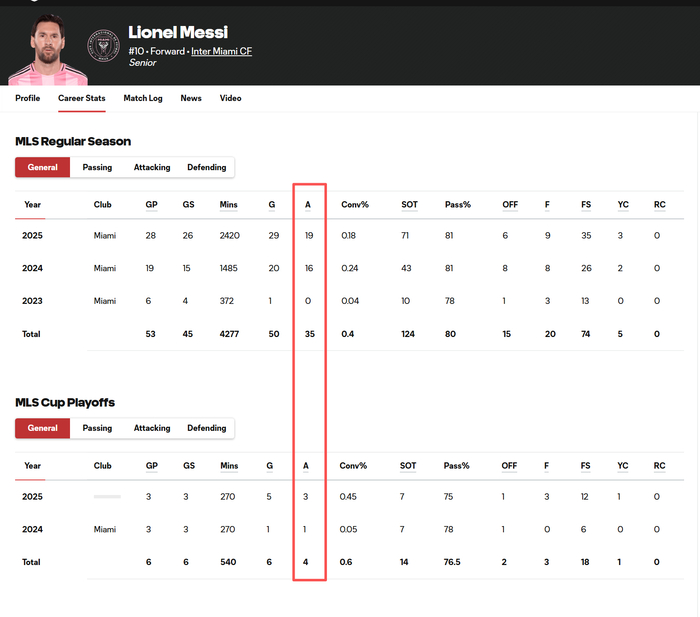 ✅若按美职联统计标准,梅西的助攻数据(409次):