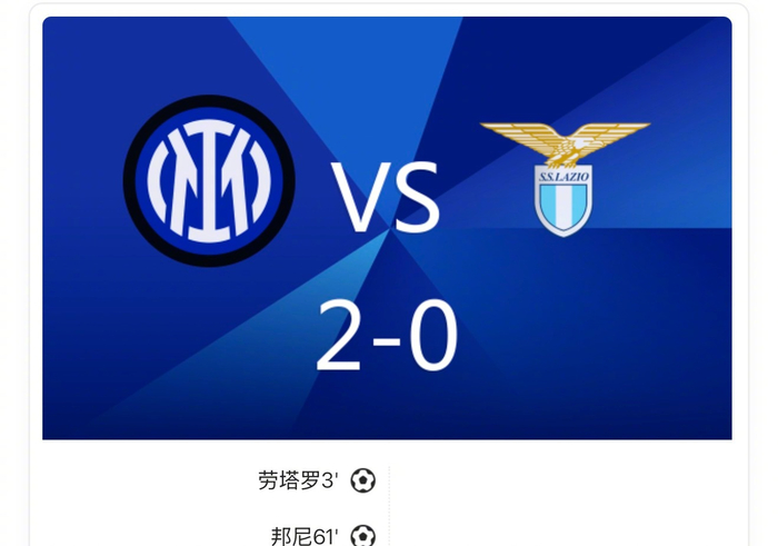 【战报:#国际米兰2比0拉齐奥# ,劳塔罗闪击,邦尼破门】上半场开场仅仅两分钟,劳塔罗闪击破门取得开门红。下半场迪马尔科助攻邦尼破门扩大比分,泽林斯基破门因迪马尔科手球被判无效。