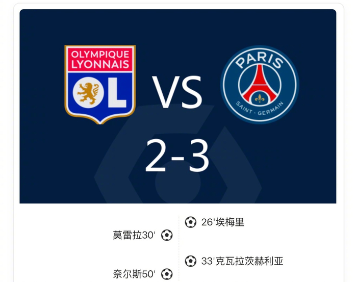 【战报:里昂2-3巴黎,埃梅里破僵,内维斯绝杀】上半场埃梅里小角度抽射破门,莫雷拉单刀扳平,克瓦拉茨赫利亚单刀建功,下半场奈尔斯吊射扳平,若昂-内维斯绝杀。