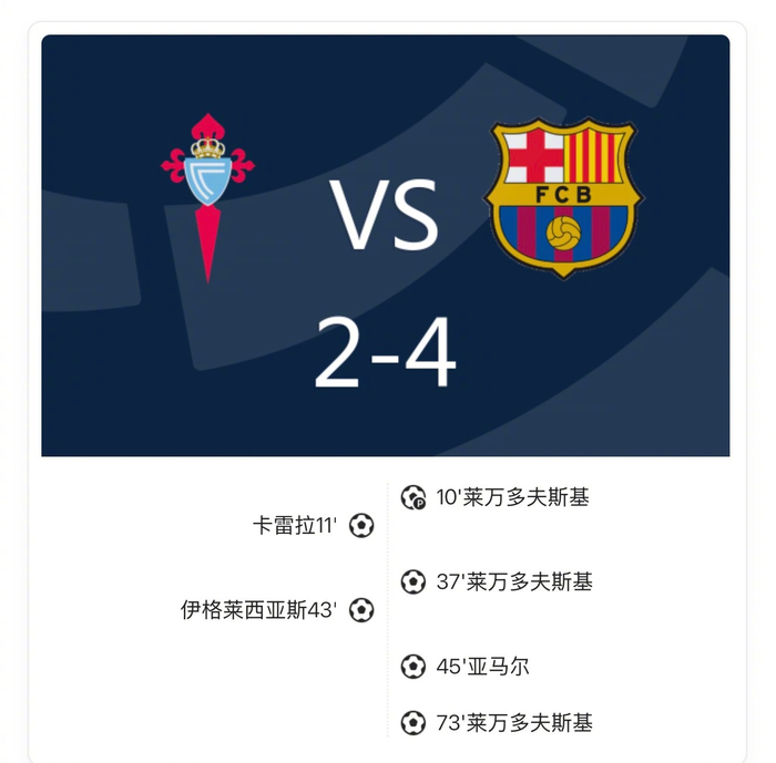 【战报:#塞尔塔2比4巴萨# ,莱万戴帽,亚马尔破门】凭借莱万多夫斯基的帽子戏法和亚马尔的进球,巴萨4-2战胜了塞尔塔。
