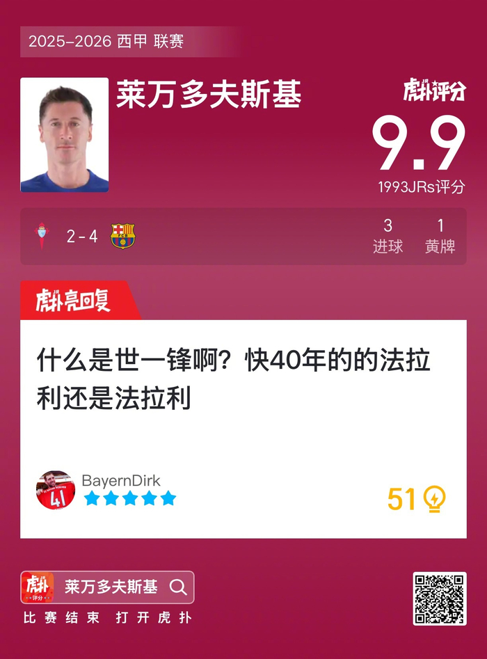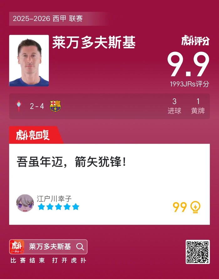 #塞尔塔2比4巴萨# 莱万打进三球吃到一张黄牌,赛后收获9.9的虎扑评分!
