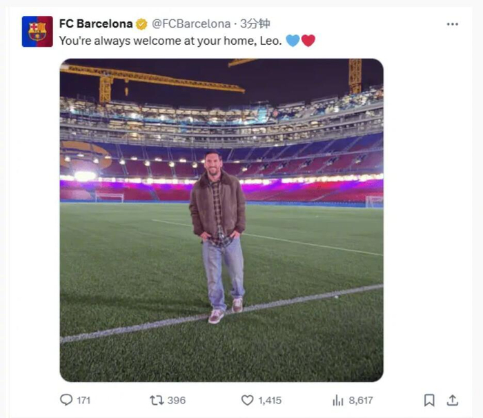 巴萨官方发布社媒,晒出了梅西在诺坎普的照片,并配文:里奥,我们永远欢迎你回家!