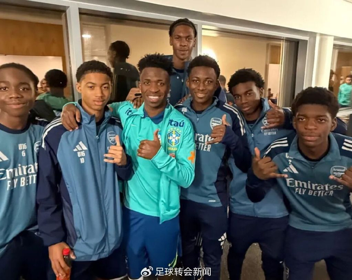 阿森纳青训小将们和巴西球星维尼修斯合影。