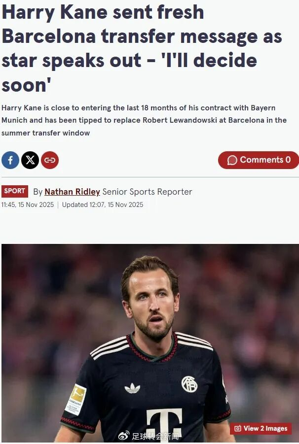 巴萨球星莱万表示,他将很快就未来作出决定,红蓝军团最近已经和凯恩联系在一起。